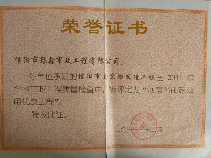 好風憑借力,送我上青云。近年來,公司積極參與城市市政基礎設施建設施工,積極參與市場競爭,先后承擔施工了市政府重點工程南京路道路改造工程、春曉路道路改造工程,東方紅大道道路改造工程、龍江東路新建工程等重點民生工程,其中南京路道路改造工程被省建設廳評為“中州杯”, 春曉路和東方紅大道道路改造工程被省建設廳評為“省優(yōu)工程”,成為城區(qū)一道道亮麗的風景線。參與施工了市典范小區(qū)“臺北城上城”、“恒大名都”以及師范學院、職業(yè)技術學院、交警支隊和軍區(qū)道路工程,參與施工了雞公山管理區(qū)、南灣管理區(qū)、明港鎮(zhèn)和羅山縣等部分道路小區(qū)工程施工,累計大小各類施工工程三百余項,企業(yè)影響力不斷擴大、輻射力不斷增強,市場份額不斷提高,企業(yè)信譽不斷彰顯,為信陽城市建設做出了積極貢獻,為企業(yè)的可持續(xù)發(fā)展插上了騰飛的翅膀。